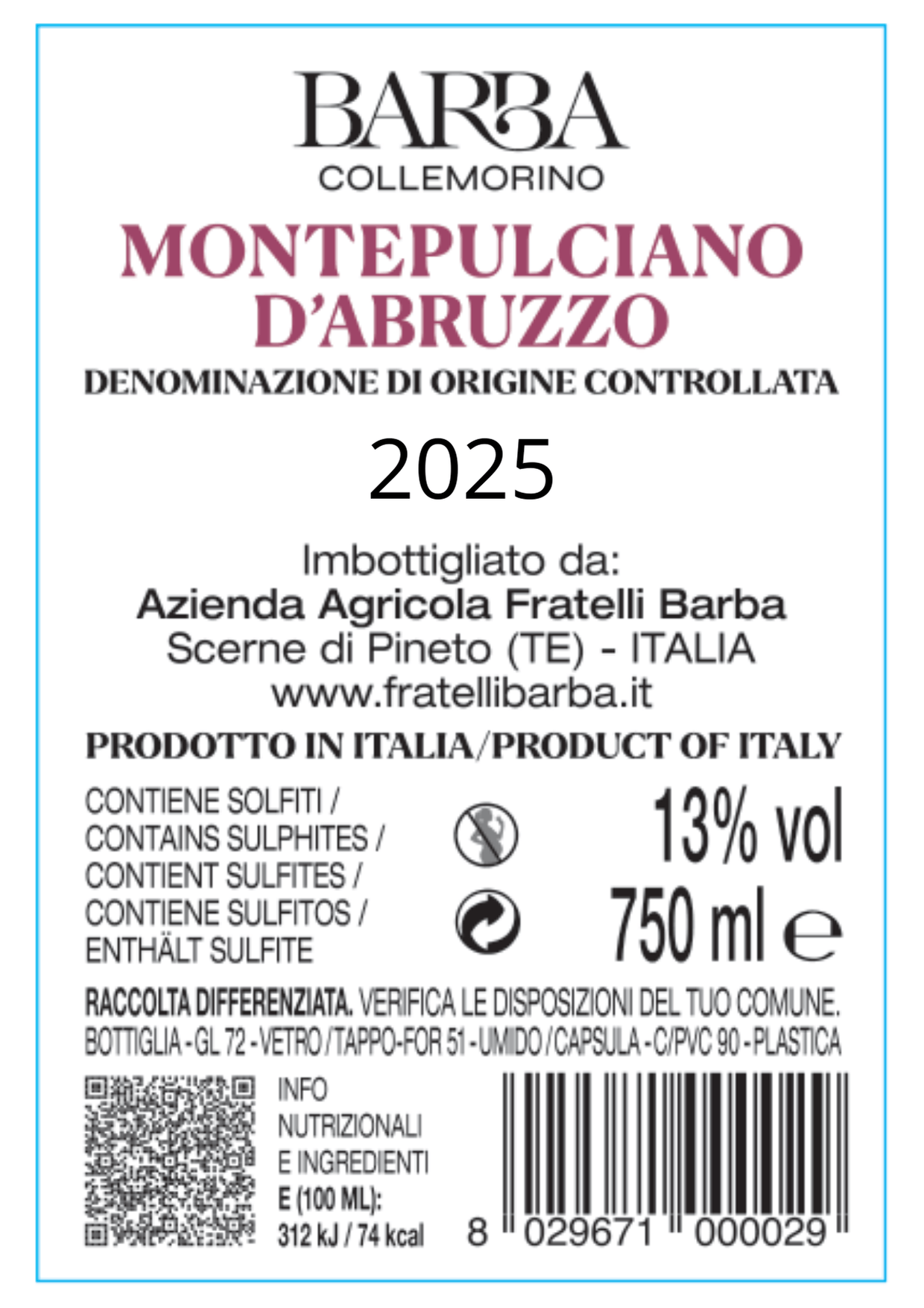 IMBOTTIGLIATO DA AZIENDA AGRICOLA FRATELLI BARBA – SCERNE DI PINETO (TE) – ITALIA